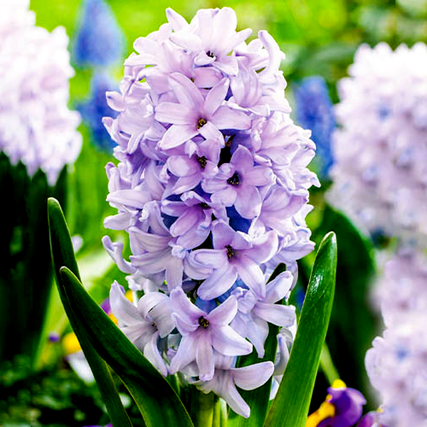 Hyacinths are fragrant spring-blooming bulbs known for their dense, cylindrical flower spikes and intense sweet perfume. These bulbs produce sturdy stems topped with clusters of small, waxy flowers in vibrant colors including deep purple, pink, white, yellow, orange, and various shades of blue.
