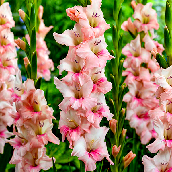 Native primarily to South Africa, with some species from the Mediterranean region, gladioli have become popular garden plants worldwide. They bloom in summer and are prized as cut flowers due to their impressive height and long-lasting blooms. The plants prefer full sun and well-drained soil, and in colder climates, the corms must be lifted and stored indoors during winter. Gladioli are excellent for creating dramatic vertical elements in flower gardens and are commonly grown in rows for cutting. There are over 260 species and countless cultivars, ranging from miniature varieties to giant exhibition types.