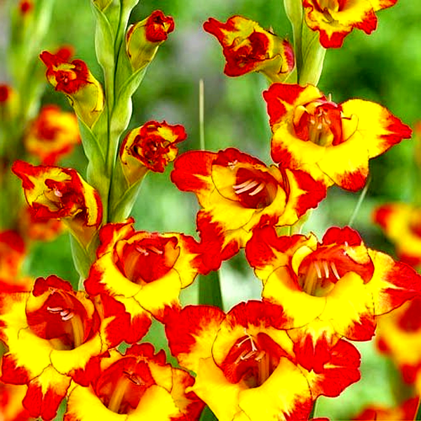 Gladiolus is a genus of perennial flowering plants that grow from corms (bulb-like underground storage organs) and are beloved for their tall, dramatic flower spikes. These striking plants produce sword-shaped leaves and towering stems that can reach 2-5 feet in height, topped with multiple funnel-shaped flowers arranged in dense, vertical clusters called racemes.