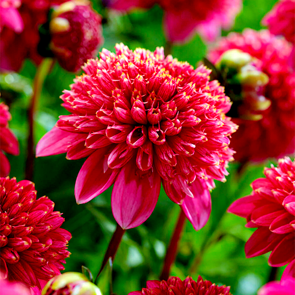 Dahlia is a genus of bushy, tuberous perennial plants native to Mexico and Central America. These popular garden flowers are prized for their spectacular blooms, which come in an extraordinary range of colors, sizes, and forms. Dahlia flowers can be as small as a coin or as large as dinner plates, with some varieties reaching over 12 inches across.