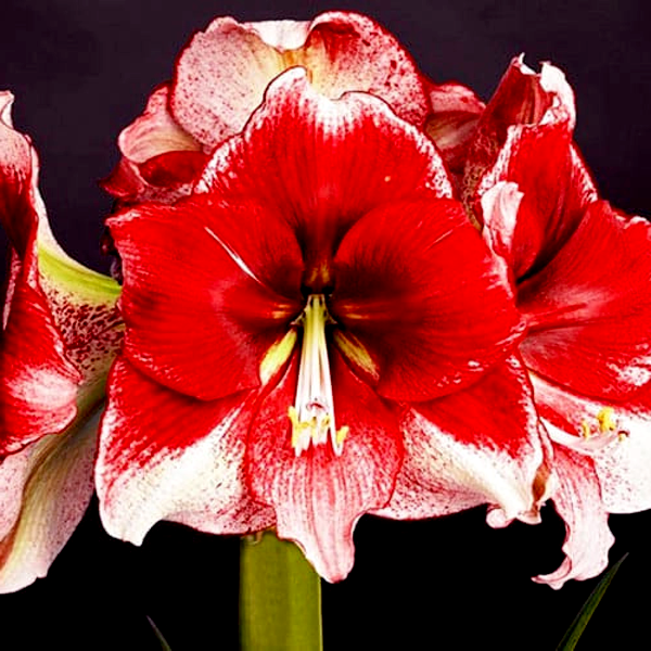 The plant grows from a large, rounded bulb that sends up a thick, hollow flower stalk called a scape, which can reach 12-24 inches tall. Each stalk typically bears 2-6 large, lily-like flowers that bloom in succession. The strap-shaped leaves are glossy green and usually emerge after or alongside the flowers, growing up to 18 inches long.