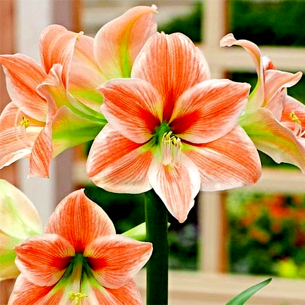 The plant grows from a large, rounded bulb that sends up a thick, hollow flower stalk called a scape, which can reach 12-24 inches tall. Each stalk typically bears 2-6 large, lily-like flowers that bloom in succession. The strap-shaped leaves are glossy green and usually emerge after or alongside the flowers, growing up to 18 inches long.