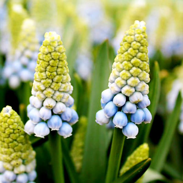 These charming spring flowers are native to the Mediterranean region and parts of Asia. They're characterized by their distinctive clusters of small, bell-shaped or urn-shaped flowers that resemble tiny grapes, hence the common name "grape hyacinth." The flowers typically come in shades of blue, purple, white, or yellow, and grow on short spikes above grass-like foliage.
