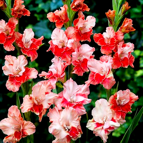 Gladiolus is a genus of perennial flowering plants that grow from corms (bulb-like underground storage organs) and are beloved for their tall, dramatic flower spikes. These striking plants produce sword-shaped leaves and towering stems that can reach 2-5 feet in height, topped with multiple funnel-shaped flowers arranged in dense, vertical clusters called racemes.