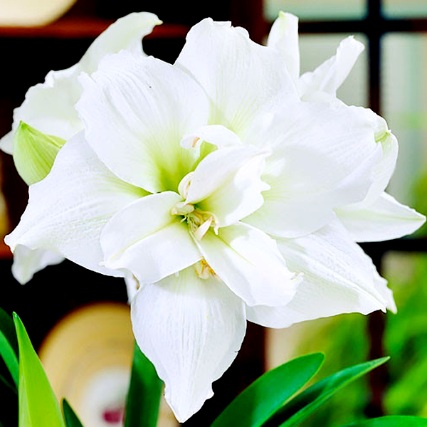 The plant grows from a large, rounded bulb that sends up a thick, hollow flower stalk called a scape, which can reach 12-24 inches tall. Each stalk typically bears 2-6 large, lily-like flowers that bloom in succession. The strap-shaped leaves are glossy green and usually emerge after or alongside the flowers, growing up to 18 inches long.