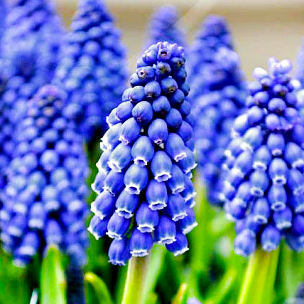 These charming spring flowers are native to the Mediterranean region and parts of Asia. They're characterized by their distinctive clusters of small, bell-shaped or urn-shaped flowers that resemble tiny grapes, hence the common name "grape hyacinth." The flowers typically come in shades of blue, purple, white, or yellow, and grow on short spikes above grass-like foliage.