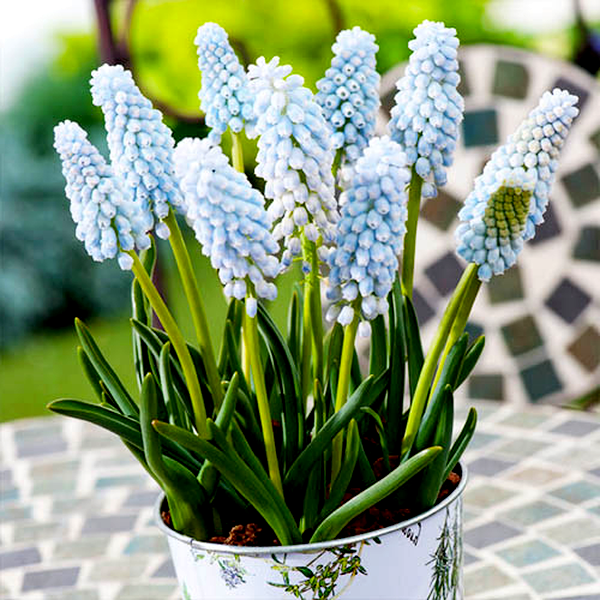 These charming spring flowers are native to the Mediterranean region and parts of Asia. They're characterized by their distinctive clusters of small, bell-shaped or urn-shaped flowers that resemble tiny grapes, hence the common name "grape hyacinth." The flowers typically come in shades of blue, purple, white, or yellow, and grow on short spikes above grass-like foliage.