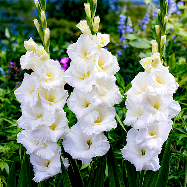 Native primarily to South Africa, with some species from the Mediterranean region, gladioli have become popular garden plants worldwide. They bloom in summer and are prized as cut flowers due to their impressive height and long-lasting blooms. The plants prefer full sun and well-drained soil, and in colder climates, the corms must be lifted and stored indoors during winter. Gladioli are excellent for creating dramatic vertical elements in flower gardens and are commonly grown in rows for cutting. There are over 260 species and countless cultivars, ranging from miniature varieties to giant exhibition types.