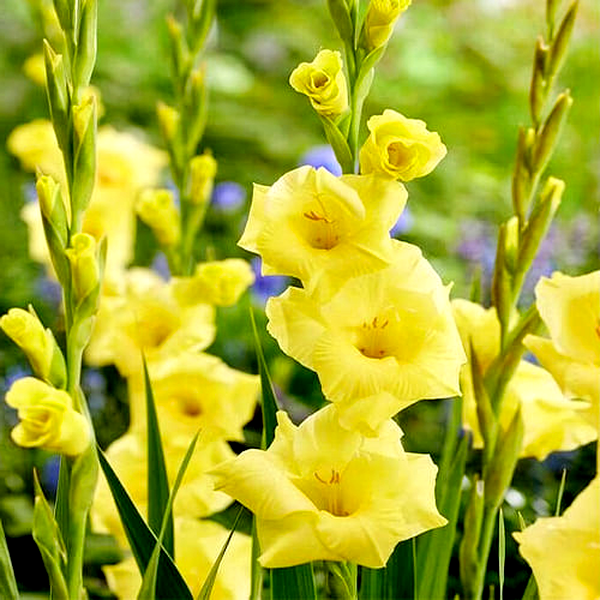 The flowers bloom sequentially from bottom to top along the spike, creating an extended flowering period. Gladioli come in virtually every color except true blue, including vibrant reds, pinks, yellows, oranges, purples, whites, and many bi-colored or ruffled varieties. Each individual flower typically measures 3-5 inches across and has six petals with prominent stamens.