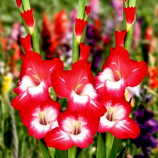 Native primarily to South Africa, with some species from the Mediterranean region, gladioli have become popular garden plants worldwide. They bloom in summer and are prized as cut flowers due to their impressive height and long-lasting blooms. The plants prefer full sun and well-drained soil, and in colder climates, the corms must be lifted and stored indoors during winter. Gladioli are excellent for creating dramatic vertical elements in flower gardens and are commonly grown in rows for cutting. There are over 260 species and countless cultivars, ranging from miniature varieties to giant exhibition types.