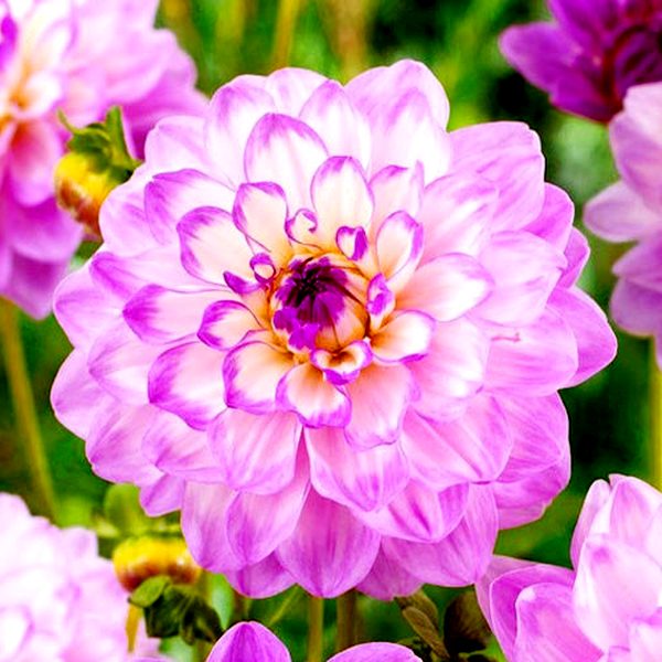 Dahlia is a genus of bushy, tuberous perennial plants native to Mexico and Central America. These popular garden flowers are prized for their spectacular blooms, which come in an extraordinary range of colors, sizes, and forms. Dahlia flowers can be as small as a coin or as large as dinner plates, with some varieties reaching over 12 inches across.