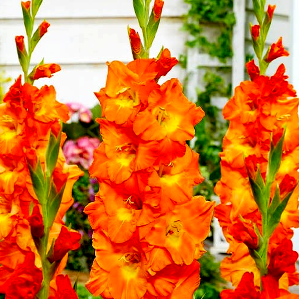 Native primarily to South Africa, with some species from the Mediterranean region, gladioli have become popular garden plants worldwide. They bloom in summer and are prized as cut flowers due to their impressive height and long-lasting blooms. The plants prefer full sun and well-drained soil, and in colder climates, the corms must be lifted and stored indoors during winter. Gladioli are excellent for creating dramatic vertical elements in flower gardens and are commonly grown in rows for cutting. There are over 260 species and countless cultivars, ranging from miniature varieties to giant exhibition types.