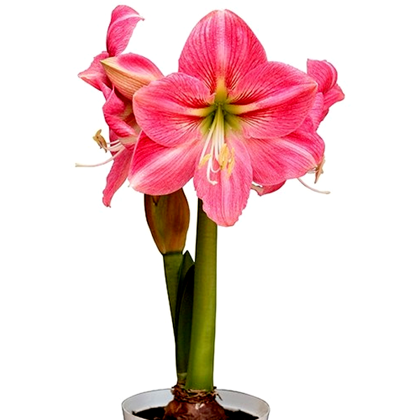 The plant grows from a large, rounded bulb that sends up a thick, hollow flower stalk called a scape, which can reach 12-24 inches tall. Each stalk typically bears 2-6 large, lily-like flowers that bloom in succession. The strap-shaped leaves are glossy green and usually emerge after or alongside the flowers, growing up to 18 inches long.