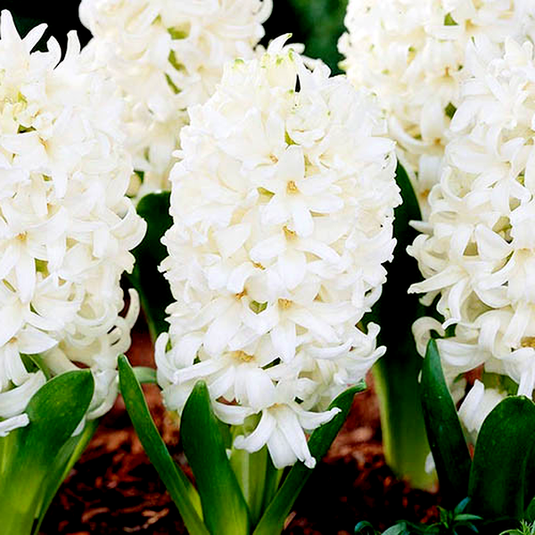 Hyacinths are fragrant spring-blooming bulbs known for their dense, cylindrical flower spikes and intense sweet perfume. These bulbs produce sturdy stems topped with clusters of small, waxy flowers in vibrant colors including deep purple, pink, white, yellow, orange, and various shades of blue.