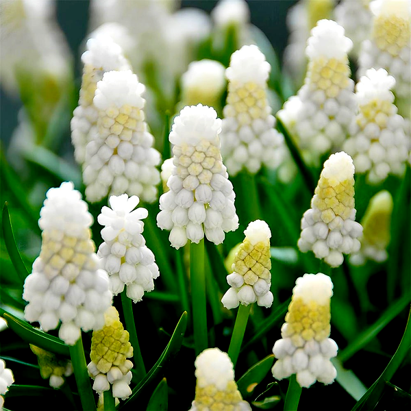 These charming spring flowers are native to the Mediterranean region and parts of Asia. They're characterized by their distinctive clusters of small, bell-shaped or urn-shaped flowers that resemble tiny grapes, hence the common name "grape hyacinth." The flowers typically come in shades of blue, purple, white, or yellow, and grow on short spikes above grass-like foliage.