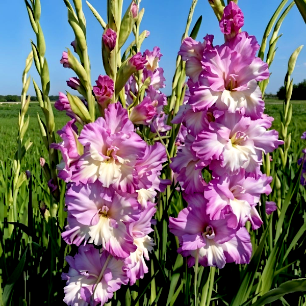 Native primarily to South Africa, with some species from the Mediterranean region, gladioli have become popular garden plants worldwide. They bloom in summer and are prized as cut flowers due to their impressive height and long-lasting blooms. The plants prefer full sun and well-drained soil, and in colder climates, the corms must be lifted and stored indoors during winter. Gladioli are excellent for creating dramatic vertical elements in flower gardens and are commonly grown in rows for cutting. There are over 260 species and countless cultivars, ranging from miniature varieties to giant exhibition types.