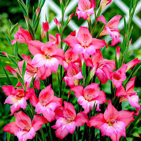 Native primarily to South Africa, with some species from the Mediterranean region, gladioli have become popular garden plants worldwide. They bloom in summer and are prized as cut flowers due to their impressive height and long-lasting blooms. The plants prefer full sun and well-drained soil, and in colder climates, the corms must be lifted and stored indoors during winter. Gladioli are excellent for creating dramatic vertical elements in flower gardens and are commonly grown in rows for cutting. There are over 260 species and countless cultivars, ranging from miniature varieties to giant exhibition types.