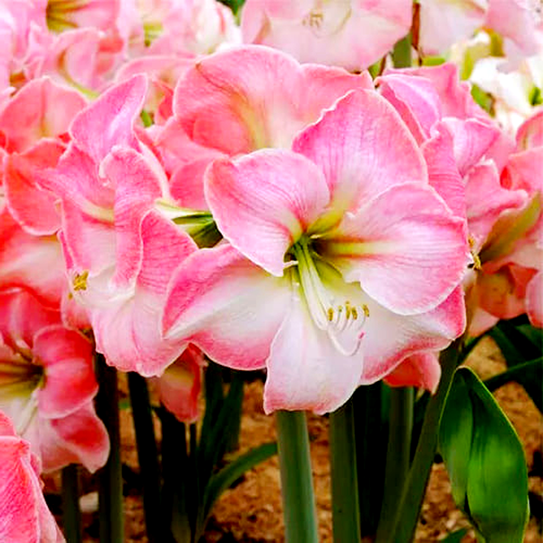 The plant grows from a large, rounded bulb that sends up a thick, hollow flower stalk called a scape, which can reach 12-24 inches tall. Each stalk typically bears 2-6 large, lily-like flowers that bloom in succession. The strap-shaped leaves are glossy green and usually emerge after or alongside the flowers, growing up to 18 inches long.