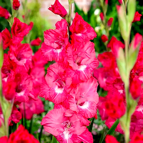 Gladiolus is a genus of perennial flowering plants that grow from corms (bulb-like underground storage organs) and are beloved for their tall, dramatic flower spikes. These striking plants produce sword-shaped leaves and towering stems that can reach 2-5 feet in height, topped with multiple funnel-shaped flowers arranged in dense, vertical clusters called racemes.