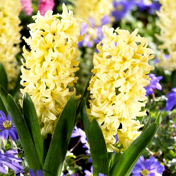 Hyacinths are fragrant spring-blooming bulbs known for their dense, cylindrical flower spikes and intense sweet perfume. These bulbs produce sturdy stems topped with clusters of small, waxy flowers in vibrant colors including deep purple, pink, white, yellow, orange, and various shades of blue.