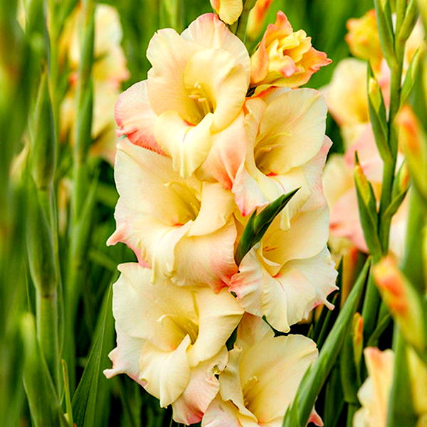 Native primarily to South Africa, with some species from the Mediterranean region, gladioli have become popular garden plants worldwide. They bloom in summer and are prized as cut flowers due to their impressive height and long-lasting blooms. The plants prefer full sun and well-drained soil, and in colder climates, the corms must be lifted and stored indoors during winter. Gladioli are excellent for creating dramatic vertical elements in flower gardens and are commonly grown in rows for cutting. There are over 260 species and countless cultivars, ranging from miniature varieties to giant exhibition types.