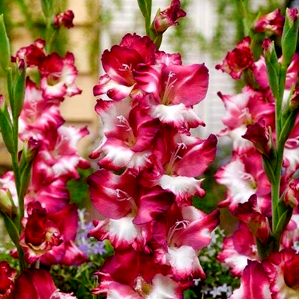 Native primarily to South Africa, with some species from the Mediterranean region, gladioli have become popular garden plants worldwide. They bloom in summer and are prized as cut flowers due to their impressive height and long-lasting blooms. The plants prefer full sun and well-drained soil, and in colder climates, the corms must be lifted and stored indoors during winter. Gladioli are excellent for creating dramatic vertical elements in flower gardens and are commonly grown in rows for cutting. There are over 260 species and countless cultivars, ranging from miniature varieties to giant exhibition types.