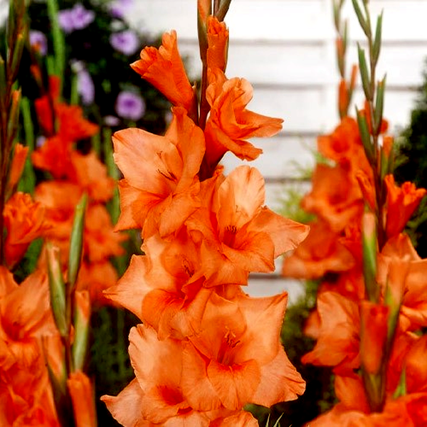 Native primarily to South Africa, with some species from the Mediterranean region, gladioli have become popular garden plants worldwide. They bloom in summer and are prized as cut flowers due to their impressive height and long-lasting blooms. The plants prefer full sun and well-drained soil, and in colder climates, the corms must be lifted and stored indoors during winter. Gladioli are excellent for creating dramatic vertical elements in flower gardens and are commonly grown in rows for cutting. There are over 260 species and countless cultivars, ranging from miniature varieties to giant exhibition types.
