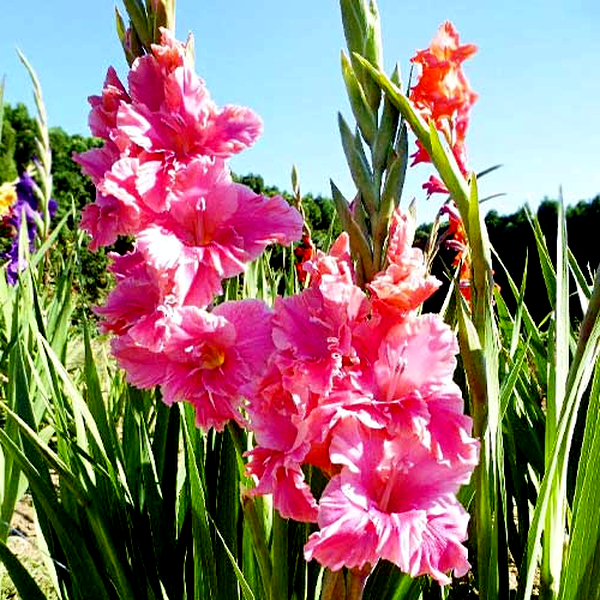 Native primarily to South Africa, with some species from the Mediterranean region, gladioli have become popular garden plants worldwide. They bloom in summer and are prized as cut flowers due to their impressive height and long-lasting blooms. The plants prefer full sun and well-drained soil, and in colder climates, the corms must be lifted and stored indoors during winter. Gladioli are excellent for creating dramatic vertical elements in flower gardens and are commonly grown in rows for cutting. There are over 260 species and countless cultivars, ranging from miniature varieties to giant exhibition types.