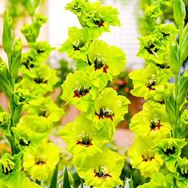 Gladiolus is a genus of perennial flowering plants that grow from corms (bulb-like underground storage organs) and are beloved for their tall, dramatic flower spikes. These striking plants produce sword-shaped leaves and towering stems that can reach 2-5 feet in height, topped with multiple funnel-shaped flowers arranged in dense, vertical clusters called racemes.