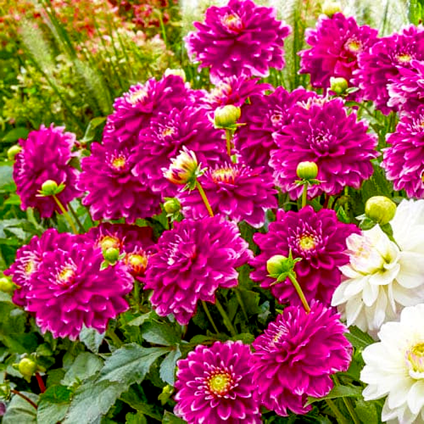 Dahlias grow from underground tubers and typically reach heights of 1-6 feet, depending on the variety. They bloom from midsummer until the first frost, making them valuable for extended garden color. The plants prefer full sun and well-drained, fertile soil. In colder climates, the tubers must be lifted and stored indoors during winter. Dahlias are excellent for cut flowers and are popular in both cottage gardens and formal landscapes. There are over 40 species and thousands of cultivars, making them one of the most diverse flowering plants available to gardeners.