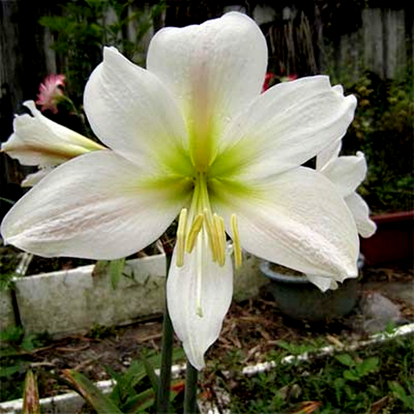 The plant grows from a large, rounded bulb that sends up a thick, hollow flower stalk called a scape, which can reach 12-24 inches tall. Each stalk typically bears 2-6 large, lily-like flowers that bloom in succession. The strap-shaped leaves are glossy green and usually emerge after or alongside the flowers, growing up to 18 inches long.