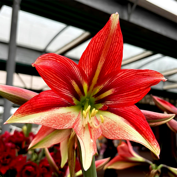Amaryllis is a striking bulbous flowering plant best known for its large, trumpet-shaped blooms that make it a popular choice for indoor flowering during winter months. The most commonly cultivated species, Hippeastrum (often called amaryllis in horticulture), produces dramatic flowers that can reach 6-8 inches across, typically in shades of red, pink, white, orange, or striped combinations.