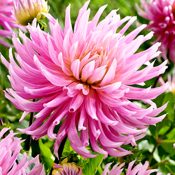 Dahlias grow from underground tubers and typically reach heights of 1-6 feet, depending on the variety. They bloom from midsummer until the first frost, making them valuable for extended garden color. The plants prefer full sun and well-drained, fertile soil. In colder climates, the tubers must be lifted and stored indoors during winter. Dahlias are excellent for cut flowers and are popular in both cottage gardens and formal landscapes. There are over 40 species and thousands of cultivars, making them one of the most diverse flowering plants available to gardeners.