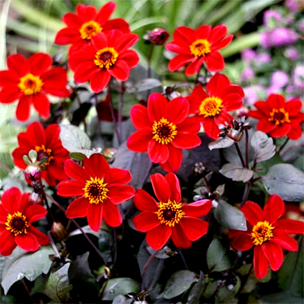 Dahlias grow from underground tubers and typically reach heights of 1-6 feet, depending on the variety. They bloom from midsummer until the first frost, making them valuable for extended garden color. The plants prefer full sun and well-drained, fertile soil. In colder climates, the tubers must be lifted and stored indoors during winter. Dahlias are excellent for cut flowers and are popular in both cottage gardens and formal landscapes. There are over 40 species and thousands of cultivars, making them one of the most diverse flowering plants available to gardeners.