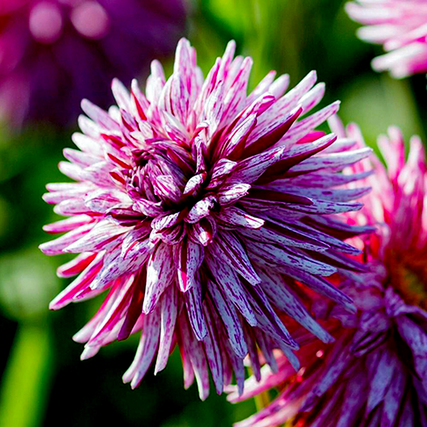 Dahlias grow from underground tubers and typically reach heights of 1-6 feet, depending on the variety. They bloom from midsummer until the first frost, making them valuable for extended garden color. The plants prefer full sun and well-drained, fertile soil. In colder climates, the tubers must be lifted and stored indoors during winter. Dahlias are excellent for cut flowers and are popular in both cottage gardens and formal landscapes. There are over 40 species and thousands of cultivars, making them one of the most diverse flowering plants available to gardeners.