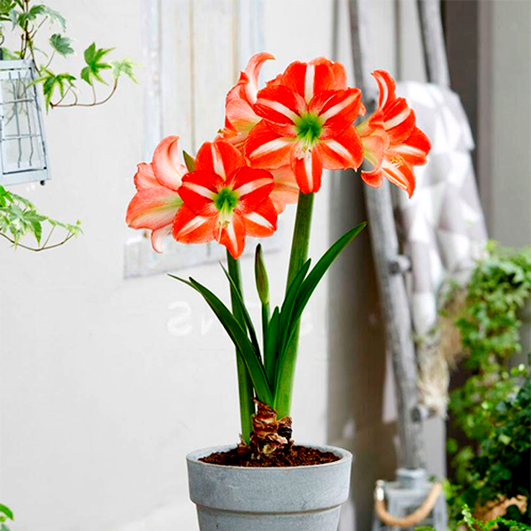 The plant grows from a large, rounded bulb that sends up a thick, hollow flower stalk called a scape, which can reach 12-24 inches tall. Each stalk typically bears 2-6 large, lily-like flowers that bloom in succession. The strap-shaped leaves are glossy green and usually emerge after or alongside the flowers, growing up to 18 inches long.