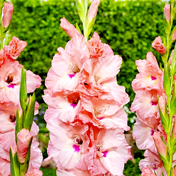 Native primarily to South Africa, with some species from the Mediterranean region, gladioli have become popular garden plants worldwide. They bloom in summer and are prized as cut flowers due to their impressive height and long-lasting blooms. The plants prefer full sun and well-drained soil, and in colder climates, the corms must be lifted and stored indoors during winter. Gladioli are excellent for creating dramatic vertical elements in flower gardens and are commonly grown in rows for cutting. There are over 260 species and countless cultivars, ranging from miniature varieties to giant exhibition types.