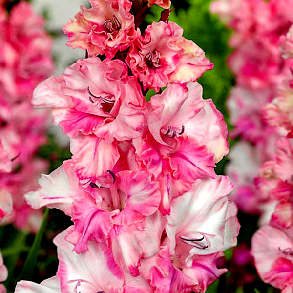 Native primarily to South Africa, with some species from the Mediterranean region, gladioli have become popular garden plants worldwide. They bloom in summer and are prized as cut flowers due to their impressive height and long-lasting blooms. The plants prefer full sun and well-drained soil, and in colder climates, the corms must be lifted and stored indoors during winter. Gladioli are excellent for creating dramatic vertical elements in flower gardens and are commonly grown in rows for cutting. There are over 260 species and countless cultivars, ranging from miniature varieties to giant exhibition types.