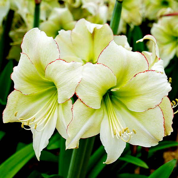 The plant grows from a large, rounded bulb that sends up a thick, hollow flower stalk called a scape, which can reach 12-24 inches tall. Each stalk typically bears 2-6 large, lily-like flowers that bloom in succession. The strap-shaped leaves are glossy green and usually emerge after or alongside the flowers, growing up to 18 inches long.