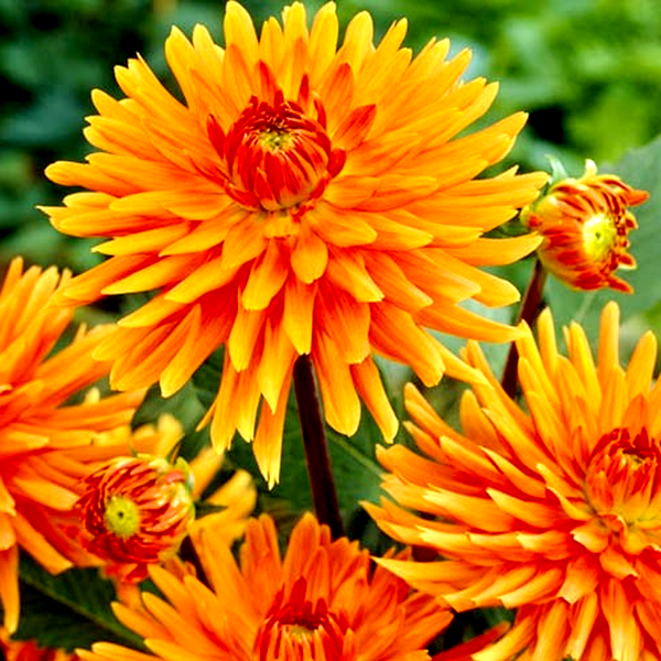 Dahlias grow from underground tubers and typically reach heights of 1-6 feet, depending on the variety. They bloom from midsummer until the first frost, making them valuable for extended garden color. The plants prefer full sun and well-drained, fertile soil. In colder climates, the tubers must be lifted and stored indoors during winter. Dahlias are excellent for cut flowers and are popular in both cottage gardens and formal landscapes. There are over 40 species and thousands of cultivars, making them one of the most diverse flowering plants available to gardeners.