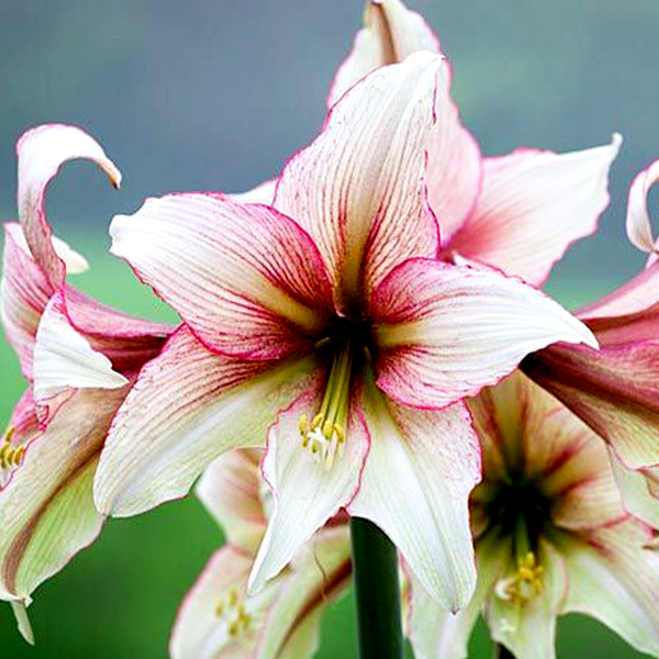 The plant grows from a large, rounded bulb that sends up a thick, hollow flower stalk called a scape, which can reach 12-24 inches tall. Each stalk typically bears 2-6 large, lily-like flowers that bloom in succession. The strap-shaped leaves are glossy green and usually emerge after or alongside the flowers, growing up to 18 inches long.
