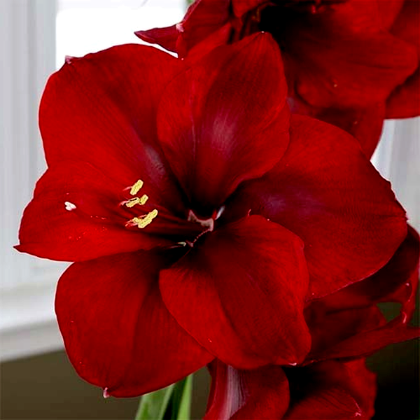 The plant grows from a large, rounded bulb that sends up a thick, hollow flower stalk called a scape, which can reach 12-24 inches tall. Each stalk typically bears 2-6 large, lily-like flowers that bloom in succession. The strap-shaped leaves are glossy green and usually emerge after or alongside the flowers, growing up to 18 inches long.