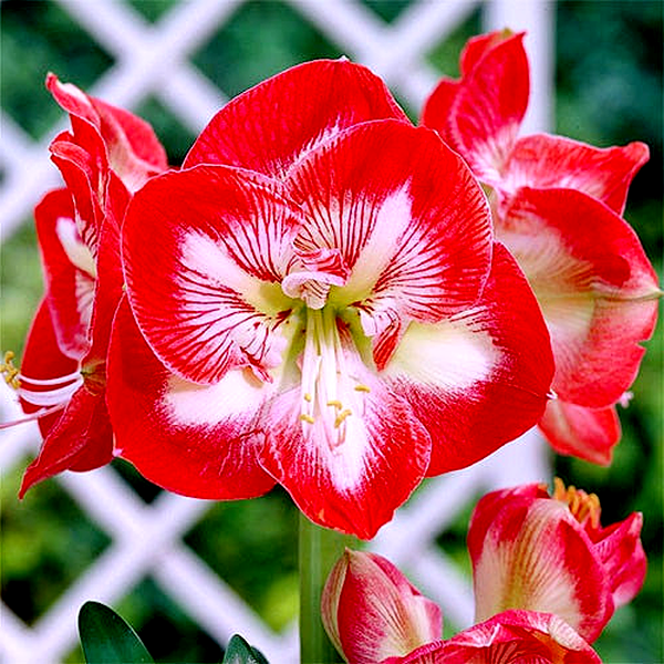 The plant grows from a large, rounded bulb that sends up a thick, hollow flower stalk called a scape, which can reach 12-24 inches tall. Each stalk typically bears 2-6 large, lily-like flowers that bloom in succession. The strap-shaped leaves are glossy green and usually emerge after or alongside the flowers, growing up to 18 inches long.