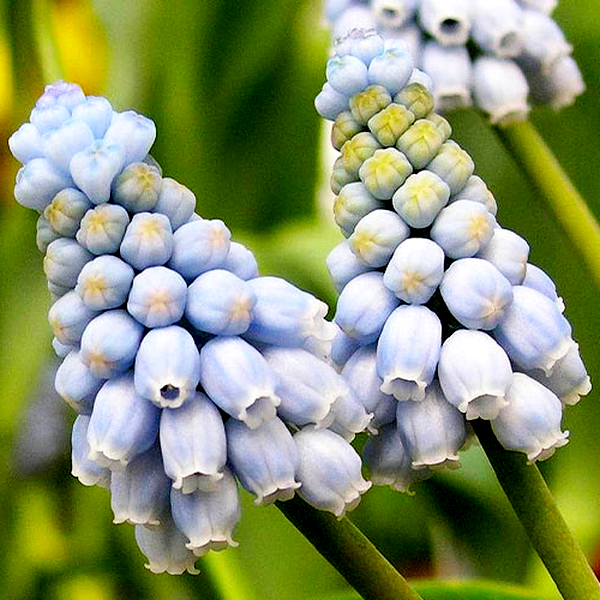 These charming spring flowers are native to the Mediterranean region and parts of Asia. They're characterized by their distinctive clusters of small, bell-shaped or urn-shaped flowers that resemble tiny grapes, hence the common name "grape hyacinth." The flowers typically come in shades of blue, purple, white, or yellow, and grow on short spikes above grass-like foliage.