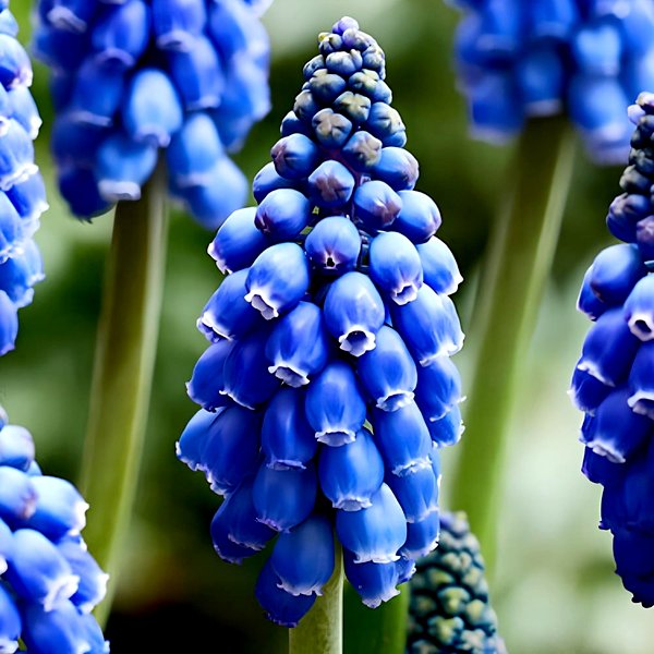 These charming spring flowers are native to the Mediterranean region and parts of Asia. They're characterized by their distinctive clusters of small, bell-shaped or urn-shaped flowers that resemble tiny grapes, hence the common name "grape hyacinth." The flowers typically come in shades of blue, purple, white, or yellow, and grow on short spikes above grass-like foliage.