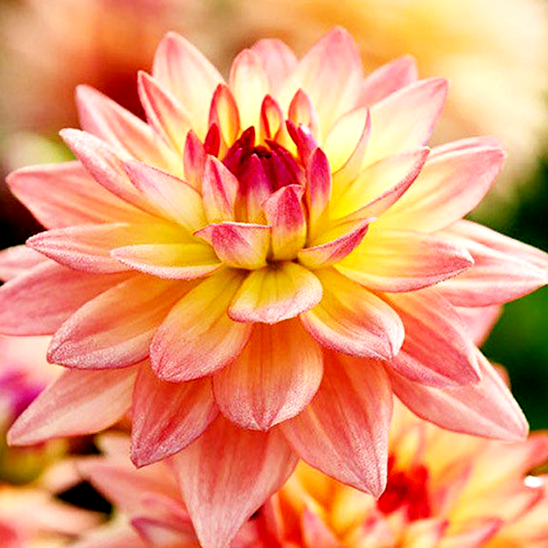 Dahlia is a genus of bushy, tuberous perennial plants native to Mexico and Central America. These popular garden flowers are prized for their spectacular blooms, which come in an extraordinary range of colors, sizes, and forms. Dahlia flowers can be as small as a coin or as large as dinner plates, with some varieties reaching over 12 inches across.