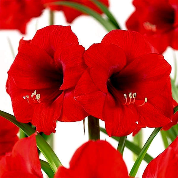 The plant grows from a large, rounded bulb that sends up a thick, hollow flower stalk called a scape, which can reach 12-24 inches tall. Each stalk typically bears 2-6 large, lily-like flowers that bloom in succession. The strap-shaped leaves are glossy green and usually emerge after or alongside the flowers, growing up to 18 inches long.