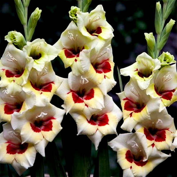 Gladiolus is a genus of perennial flowering plants that grow from corms (bulb-like underground storage organs) and are beloved for their tall, dramatic flower spikes. These striking plants produce sword-shaped leaves and towering stems that can reach 2-5 feet in height, topped with multiple funnel-shaped flowers arranged in dense, vertical clusters called racemes.