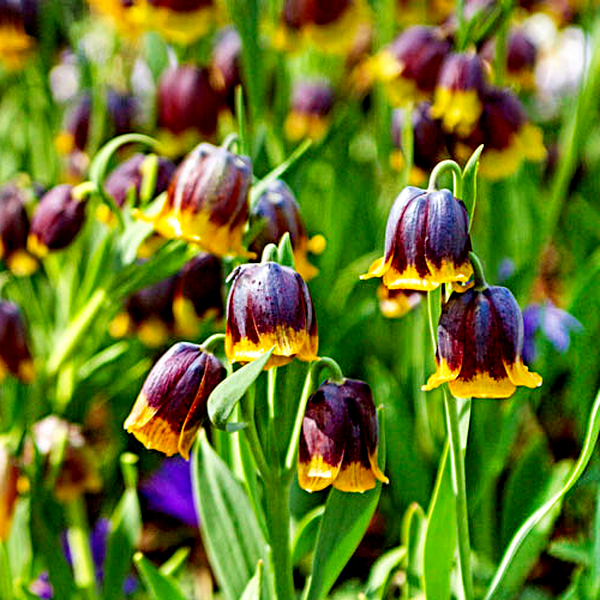Fritillaria is a genus of bulbous flowering plants known for their distinctive drooping, bell-shaped flowers that often display intricate checkered or spotted patterns. The name comes from the Latin "fritillus," meaning dice box, referring to the checkered pattern resembling a Roman dice cup found on many species.