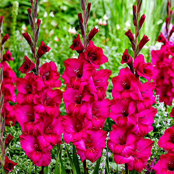 Native primarily to South Africa, with some species from the Mediterranean region, gladioli have become popular garden plants worldwide. They bloom in summer and are prized as cut flowers due to their impressive height and long-lasting blooms. The plants prefer full sun and well-drained soil, and in colder climates, the corms must be lifted and stored indoors during winter. Gladioli are excellent for creating dramatic vertical elements in flower gardens and are commonly grown in rows for cutting. There are over 260 species and countless cultivars, ranging from miniature varieties to giant exhibition types.